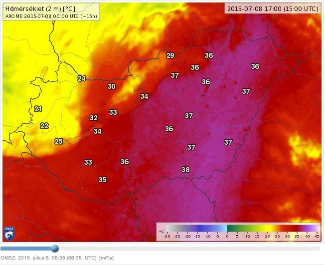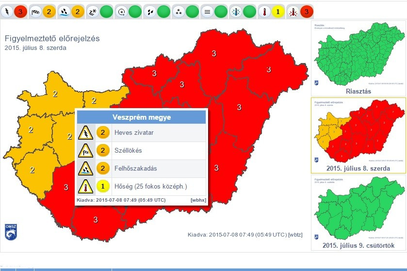 Hőségre és heves zivatarra egyaránt figyelmeztet az Országos Meteorológiai Szolgálat szerdára. Napközben még magasra kúszik a hőmérő higanyszála, ismét megközelíti a 35°C-ot, délután azonban zivatarok kíséretében hidegfront érkezik. Kedden egyébként még 36°C volt a legmelegebb órákban a vmeteo.hu mérése szerint Veszprémben.