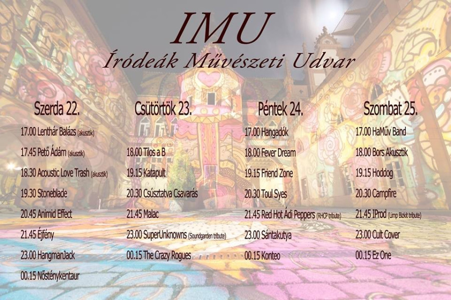 Veszprémi rock-bandákkal az élen, az Utcazene ideje alatt idén is megrendezik az Íródeák Művészeti Udvar nevű koncertsorozatot, az IMU-t.