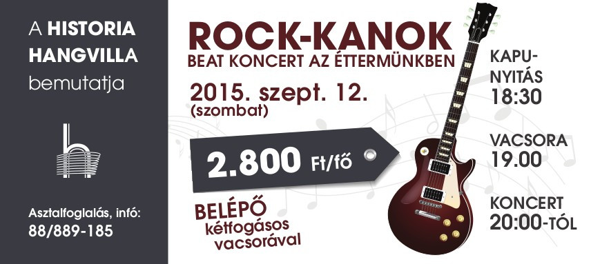 Fergeteges Beat koncert a Rock-Kanok részvételével a Historia Hangvilla Éttermében. Az együttes gazdag repertoárjából idézi fel a beat korszak legszebb örökzöld dalait, garantálva minden korosztály számára az önfeledt szórakozás és táncolás lehetőségét. Az este egy 2 fogásos vacsorával kezdődik mely a koncert előtt kerül felszolgálásra.