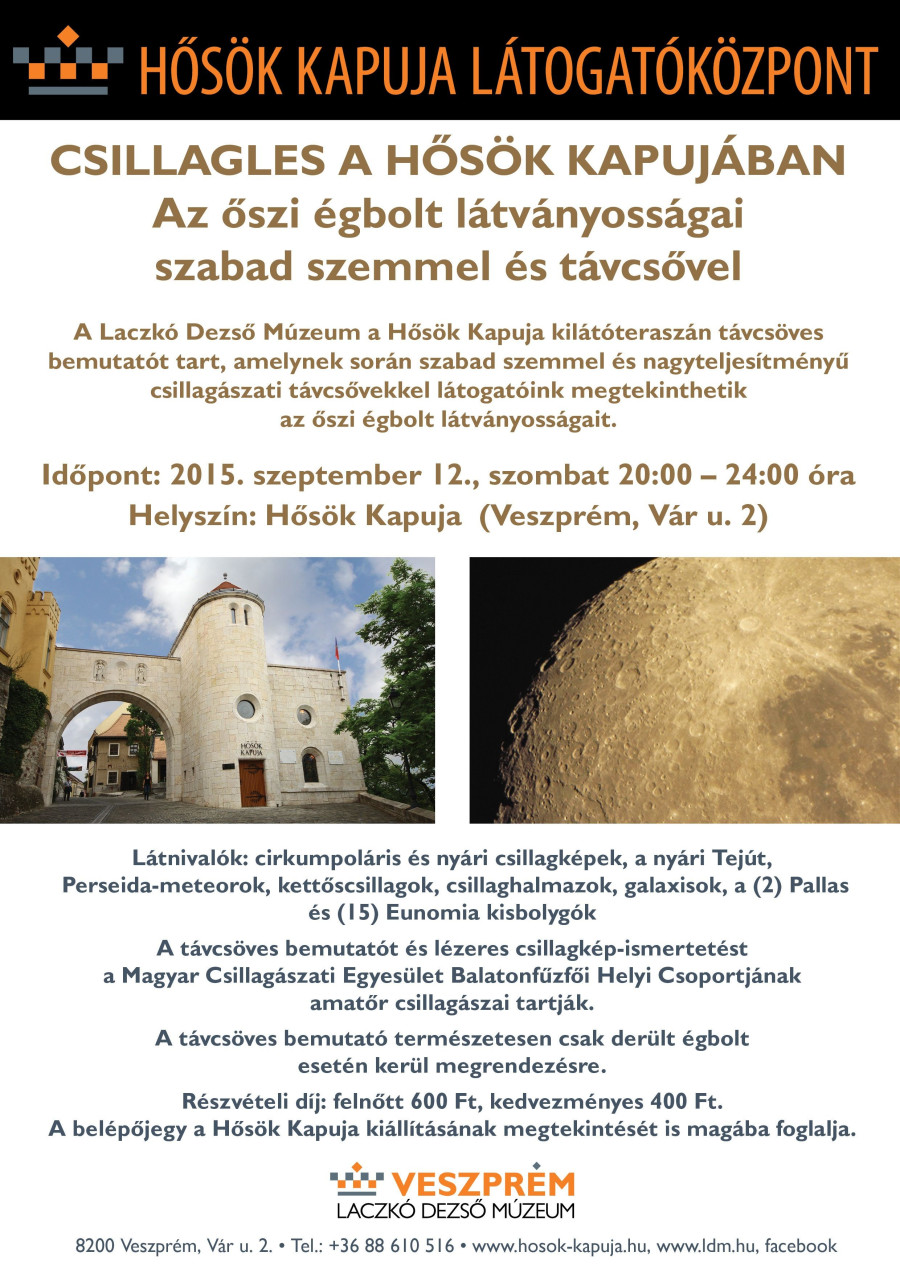 A távcsöves bemutatót és lézeres csillagkép-ismertetést a Magyar Csillagászati Egyesület Balatonfűzfői Helyi Csoportjának amatőr csillagászai tartják saját távcsöveikkel. A távcsöves bemutatót természetesen csak derült égbolt esetén rendezik meg.