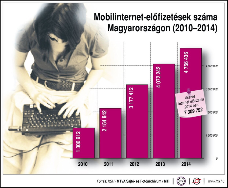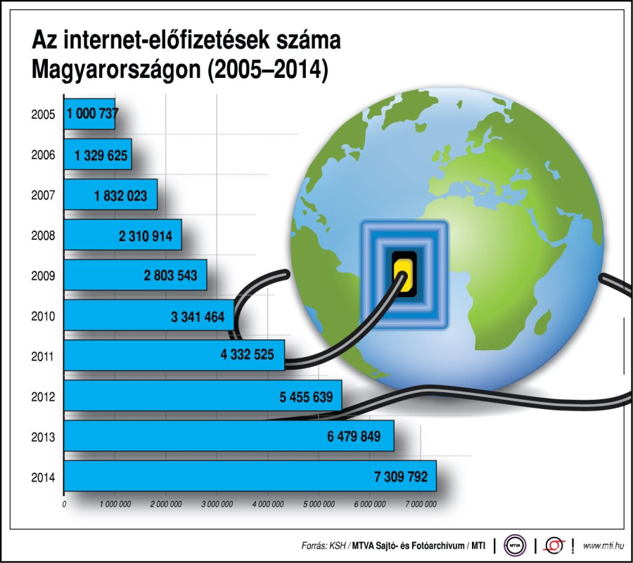 Az MTI héten közzétett adatai szerint folyamatosan növekszik az internet előfizetők száma Magyarországon. Az alábbi grafikonok látszik, hogy évente gyakorlatilag majdnem 1 millióval lesznek többen azok, akik internetet használnak.