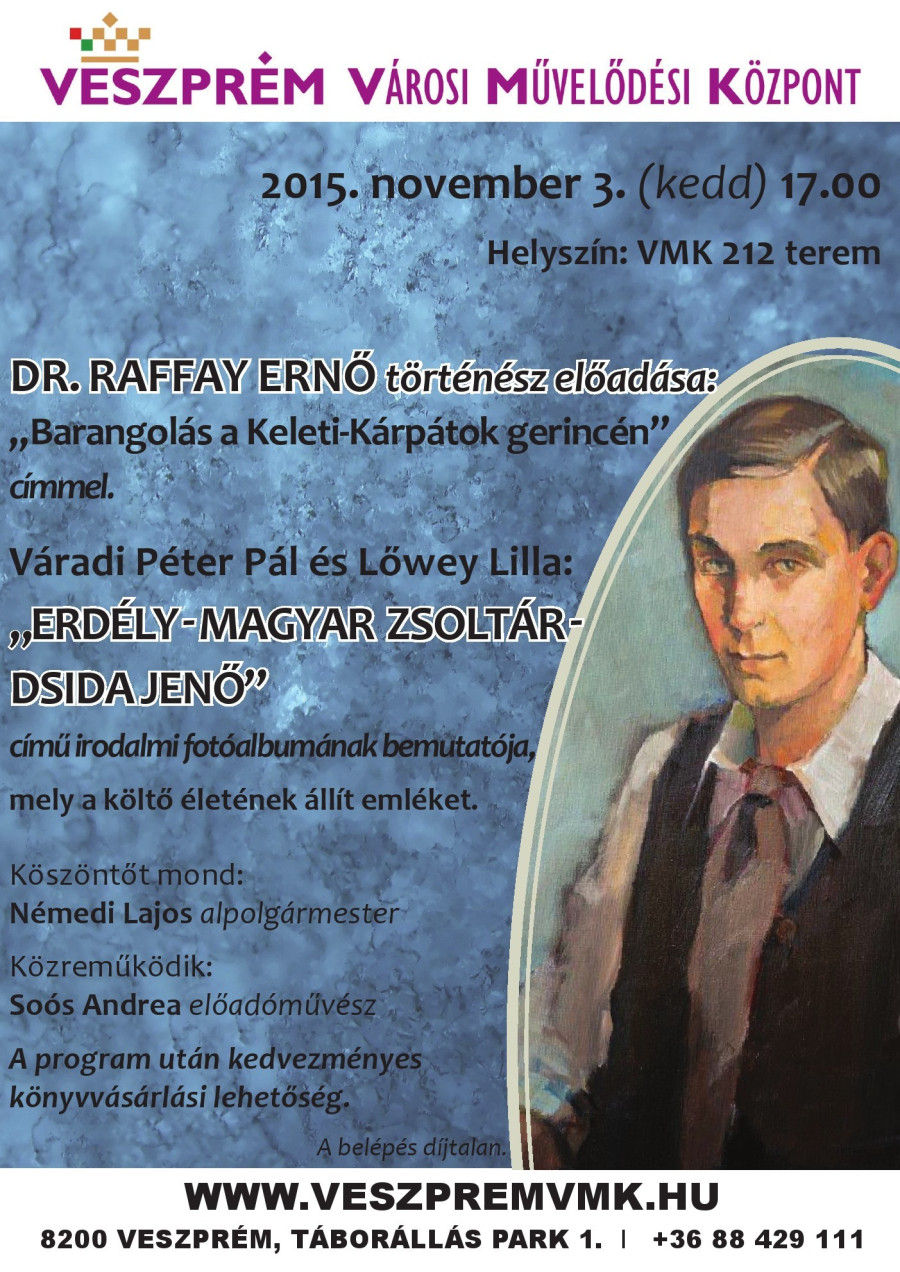 2015. november 3-án, 17 órakor mutatják be Veszprémben, a Városi Művelődési Központban a Váradi Péter Pál – Lőwey Lilla szerzőpáros Kárpátok koronája – Keleti-Kárpátok 1. című fotóalbumát, mely a Kárpát-kanyar tájaira invitálja az érdeklődőket. A bevezető előadást Dr. Raffay Ernő tartja, „Barangolás a Kárpátok gerincén” címmel. Az előadást követően kerül sor a Dsida Jenő életéről szóló fotóalbum bemutatására.