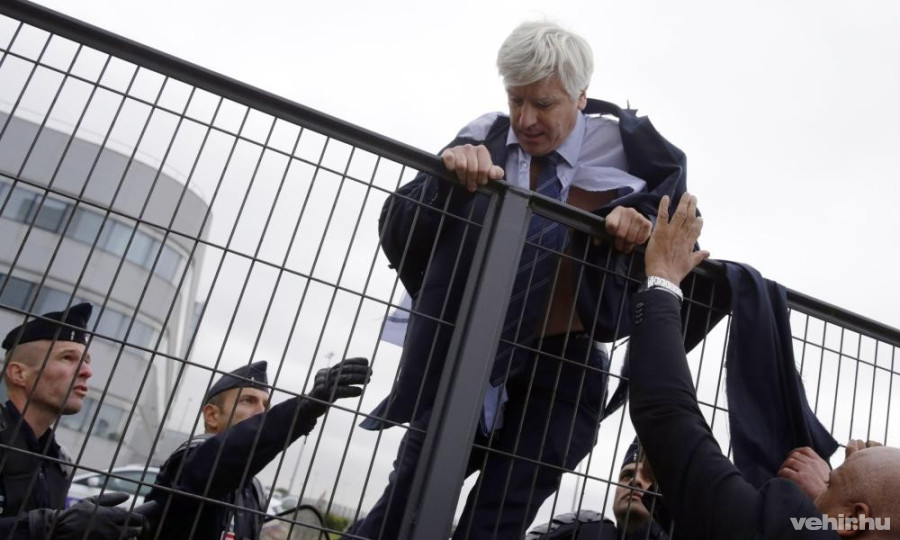 Az Air France igazgatója biztonsági őrök segítségével, a kerítésen átmászva menekül a rátörő alkalmazottak elől Fotó: Kenzo Tribouillard