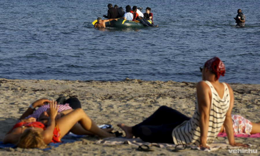 Turisták a tengerparton, migránsok a mentőcsónakban; Kos szigete, Fotó: Yannis Behrakis
