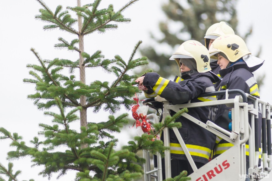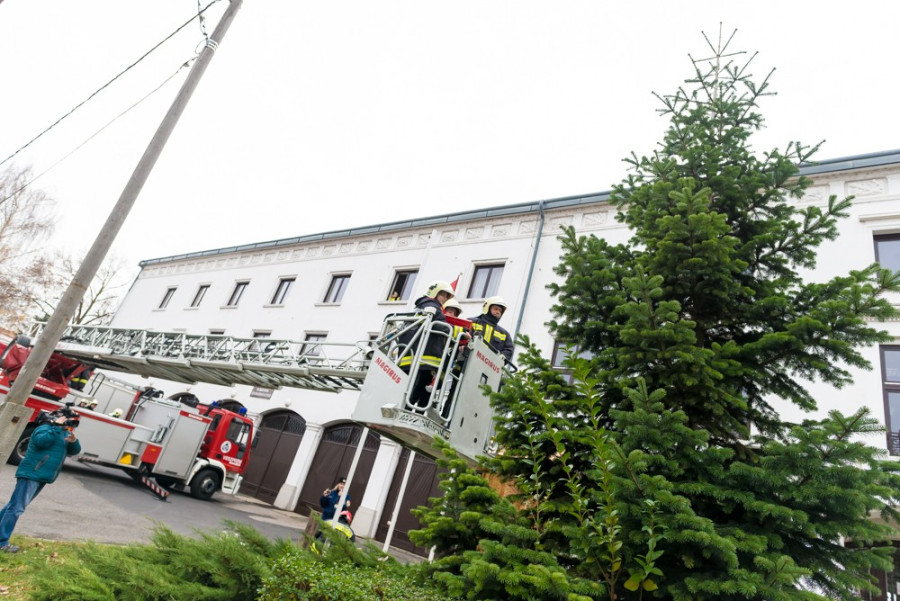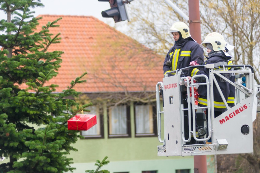 A kisdiákok a katasztrófavédelem daruja segítségével helyezhették el díszeiket a Dózsa utcai épület előtt található fenyőfára.