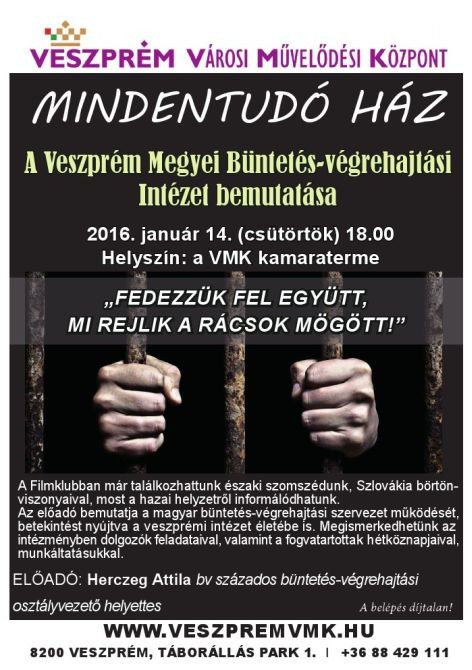 A Veszprém Megyei Büntetés-végrehajtási Intézet bemutatása. Január 14. csütörtök. Agóra kamaraterem.