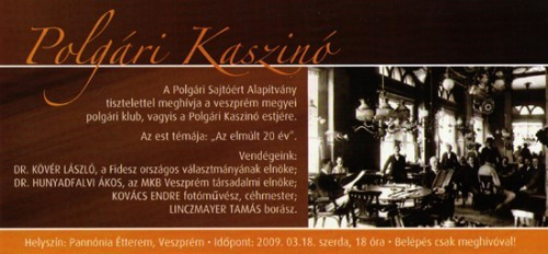Várta tehát a nagyérdemű a februári folytatást, ami (információnk szerint cégbejegyzési problémák miatt) elmaradt. De sebaj: márciusban (pontosabban 18-án, szerdán) ismét egymás nyakába borulhattak a Nagy Ügyet lelkükön viselők. A Polgári Sajtóért Alapítvány elegáns meghívóval invitálta a népet a veszprém megyei polgári klub (így, kisbetűvel!!!), vagyis a Polgári Kaszinó estjére. A vendégek között ott olvashattuk az egyik nagybajuszos politikus nevét is, meg egy fotóművészét is.