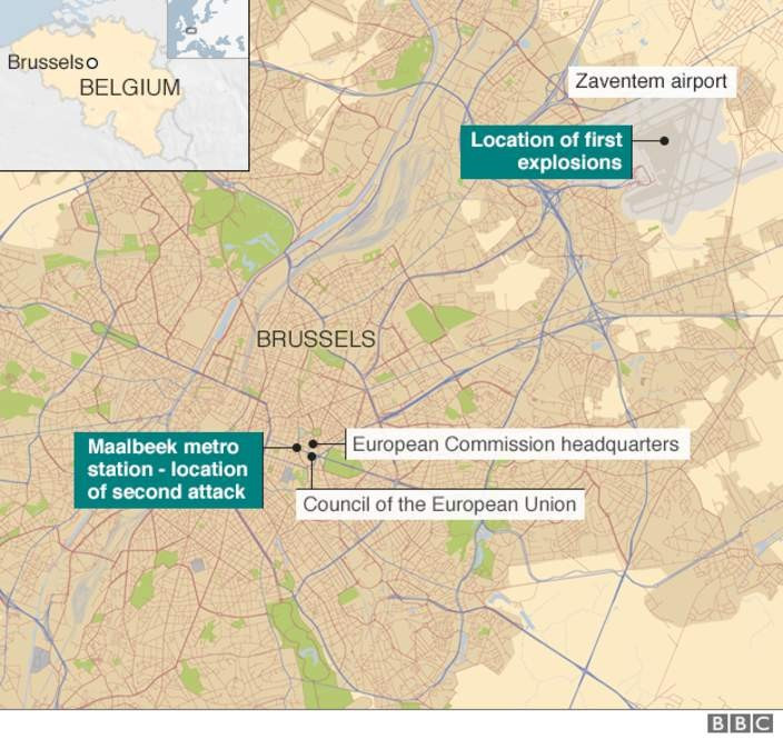A BBC fenti grafikáján láthatók a támadások helyszínei. Északon a Zaventem repülőtér, a belvárosban zölddel a Maalbeek metróállomást jelölték. Ahogy látszik, a metróállomás közvetlen közelében található az Európai Bizottság (Commission) és az Európai Unió Tanácsa (Council) központja.