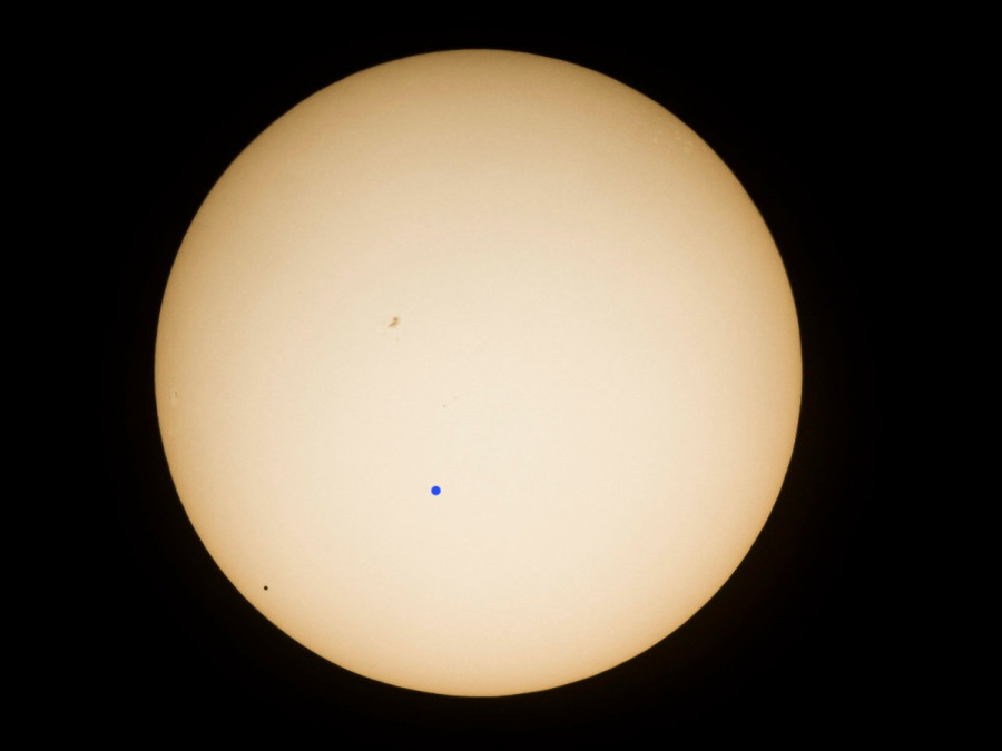 Az alábbi fotót Komka Péter készítette az MTI részére, én pedig picit belerondítottam. A képen a Nap bal alsó régiójában látható fekete pont a Merkúr. A fotóra elhelyeztem egy kék pontot: ez arányaiban a Föld méreteinek felel meg. Valamivel feljebb látható egy hasonló méretű szürkés kosz: az egy napfolt.