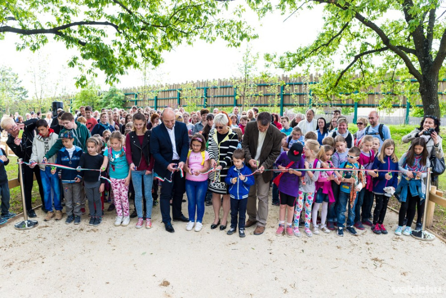 Takács Szabolcs kormánymegbízott, Brányi Mária alpolgármester és Török László állatkert igazgató ünnepélyes szalagátvágása veszprémi iskolásokkal.