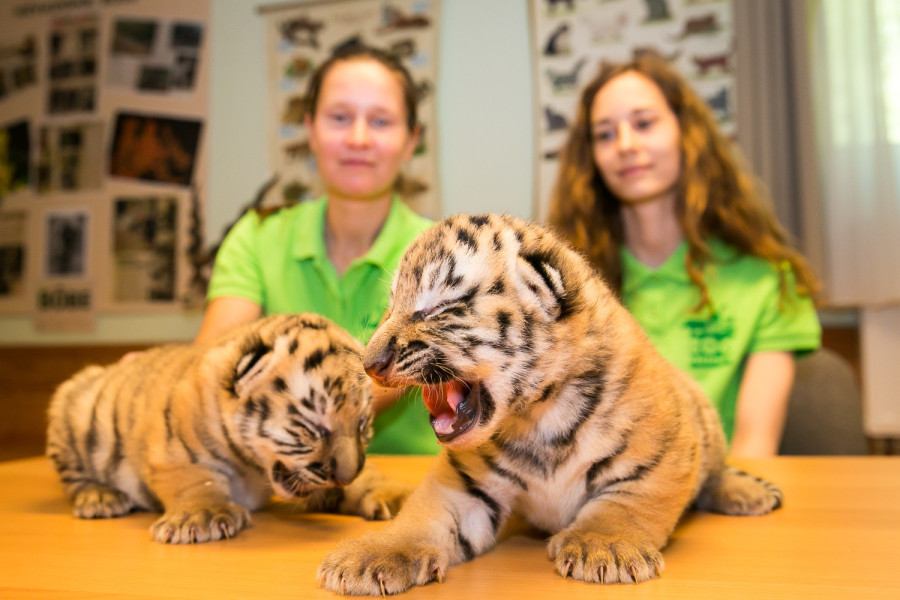 Török László elmondta, hogy a két tigris május végén látta meg a napvilágot, az anyaállat, Kátya, akinek ők az első kölykei, nagy odafigyeléssel gondozza a fiatal ragadozókat. A kistigrisek, három hónapos korukig csupán anyatejjel táplálkoznak. A szemük a második héten nyílik ki, addig az anyaállat közelében töltik napjaikat.