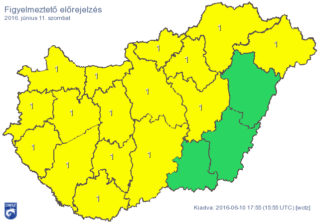 Szombatra Csongrád, Békés és Hajdú-Bihar megye kivételével az egész országra figyelmeztetést adtak ki az esőzések miatt. Tizenhat megyére és a fővárosra a felhőszakadás veszélye miatt adtak ki elsőfokú figyelmeztetést. Ezeken a területeken az intenzív záporokból, zivatarokból rövid idő alatt 25-30 milliméternél is több csapadék eshet. Győr-Moson-Sopron és Komárom-Esztergom megyére a nap folyamán várható sok eső miatt is kiadták az elsőfokú figyelmeztetést.