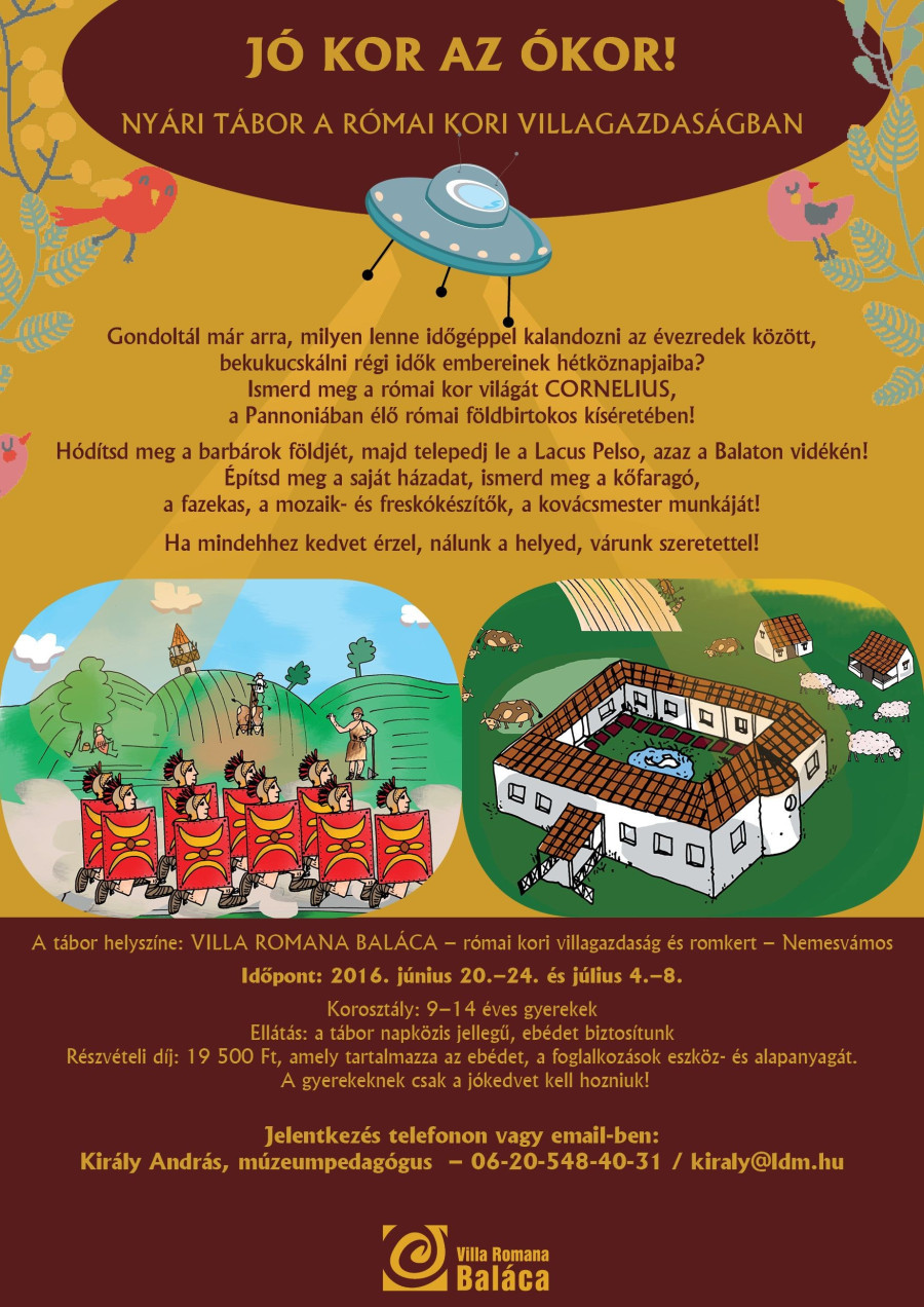 A Villa Romana Baláca római kori nyári tábort rendez gyermekek számára a villagazdaság területén 2016. június 20.–24. és július 4.–8. között 9-14 éves gyerekek részére. A tábor napközis jellegű, ebédet biztosítanak. A részvételi díj 19 500 Ft, amely tartalmazza az ebédet, a foglalkozások eszköz- és alapanyagát. Jelentkezni telefonon vagy e-mailben Király András múzeumpedagógusunknál: +36 20 548 4031; kiraly@ldm.hu
