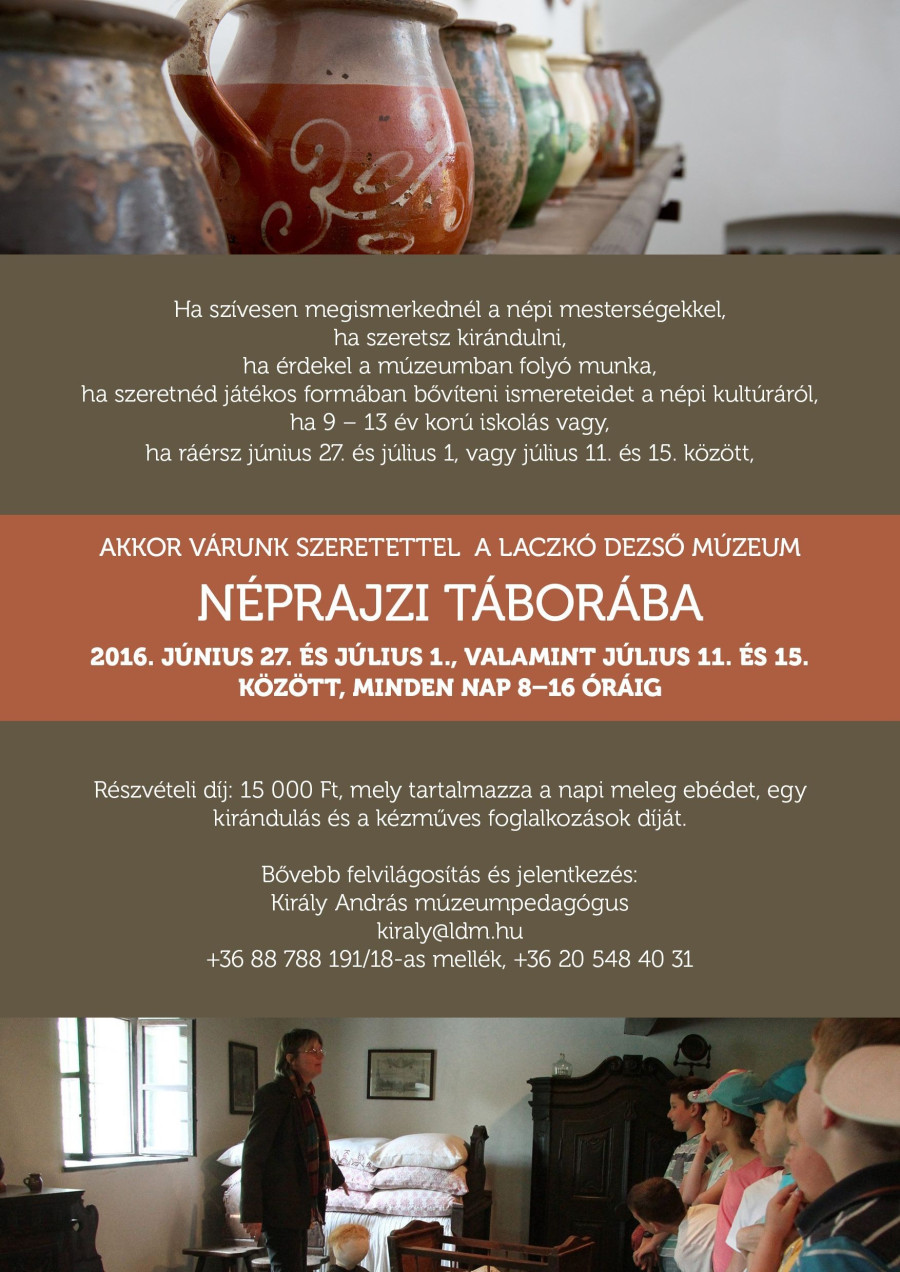 A Laczkó Dezső Múzeum néprajzi nyári tábort szervez Veszprémben, a Bakonyi Házban két turnusban: 2016. június 27. és július 1., valamint július 11. és július 15. között. Elsősorban azon 9 – 13 év korú iskolások jelentkezését várják, akik szívesen megismerkednének a népi mesterségekkel, szeretnek kirándulni, akiket érdekel a múzeumban folyó munka, szeretnének játékos formában bővíteni ismereteiket a népi kultúráról. A táborban naponta 8-16 óra között várják a gyerekeket.