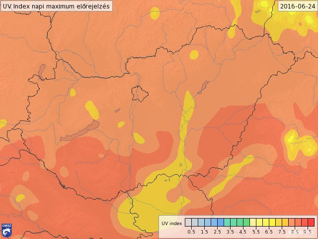 Az Országos Meteorológiai Szolgálat felhívja a figyelmet arra, hogy a holnapi napon (2016. június 24.) a figyelmeztetési értéket meghaladó, 8.7-es (extrém) UV-B sugárzás várható. Kérjük, fokozottan védekezzenek a napsugárzás által okozott leégés ellen. Amennyiben lehetséges napközben 11:00 és 15:00 óra között kerüljék a napozást. Vállat takaró póló, szalmakalap, illetve fényvédő krém használata mindenképpen javasolt. Normál bőrtípusnál már 15-20 perc napon tartózkodás esetén is bőrpír, 24 óra múlva is jól látható égés keletkezhet.