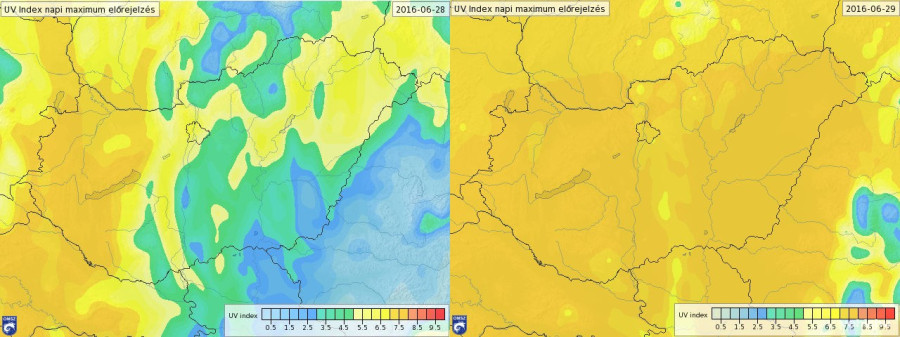 figyelmeztetési értéket meghaladó, 7.8-es (nagyon erős) UV-B sugárzás várható. Kérjük, fokozottan védekezzenek a napsugárzás által okozott leégés ellen. Amennyiben lehetséges napközben 11:00 és 15:00 óra között kerüljék a napozást. Vállat takaró póló, szalmakalap, illetve fényvédő krém használata mindenképpen javasolt. Normál bőrtípusnál már 15-20 perc napon tartózkodás esetén is bőrpír keletkezhet.