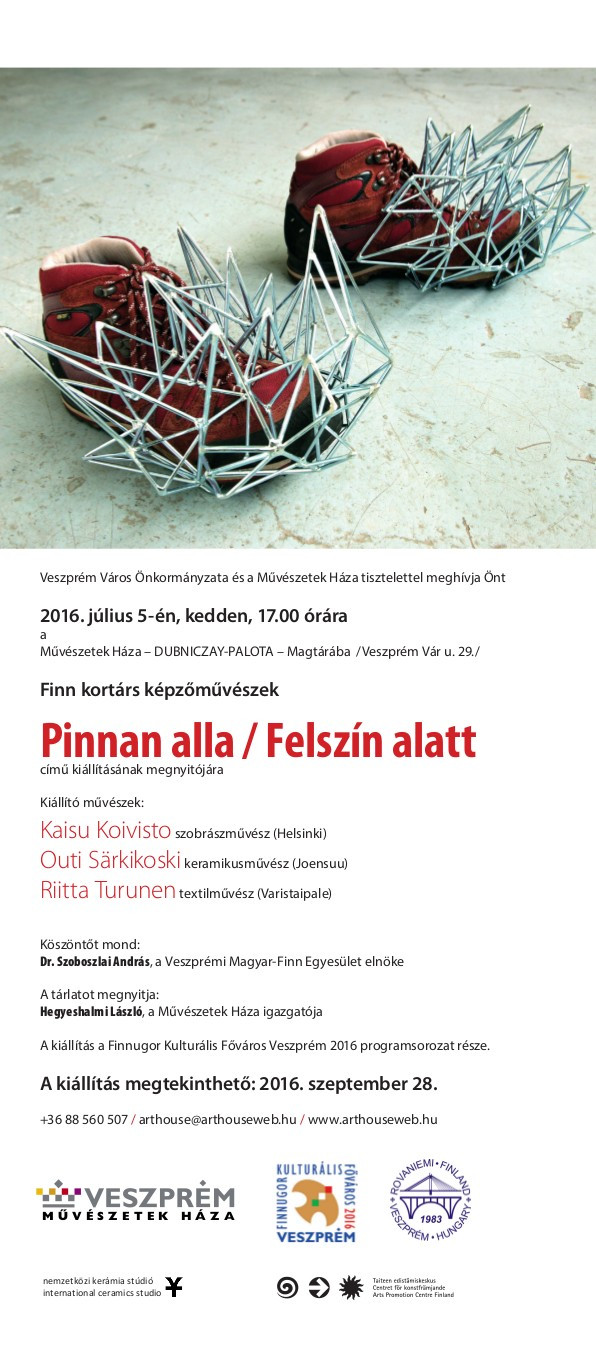 Veszprém Város Önkormányzata és a Művészetek Háza tisztelettel meghívja Önt 2016. július 5-én, kedden, 17.00 órára a Művészetek Háza – DUBNICZAY-PALOTA – Magtárába /Veszprém Vár u. 29./ Finn kortárs képzőművészek Pinnan alla / Felszín alatt című kiállításának megnyitójára