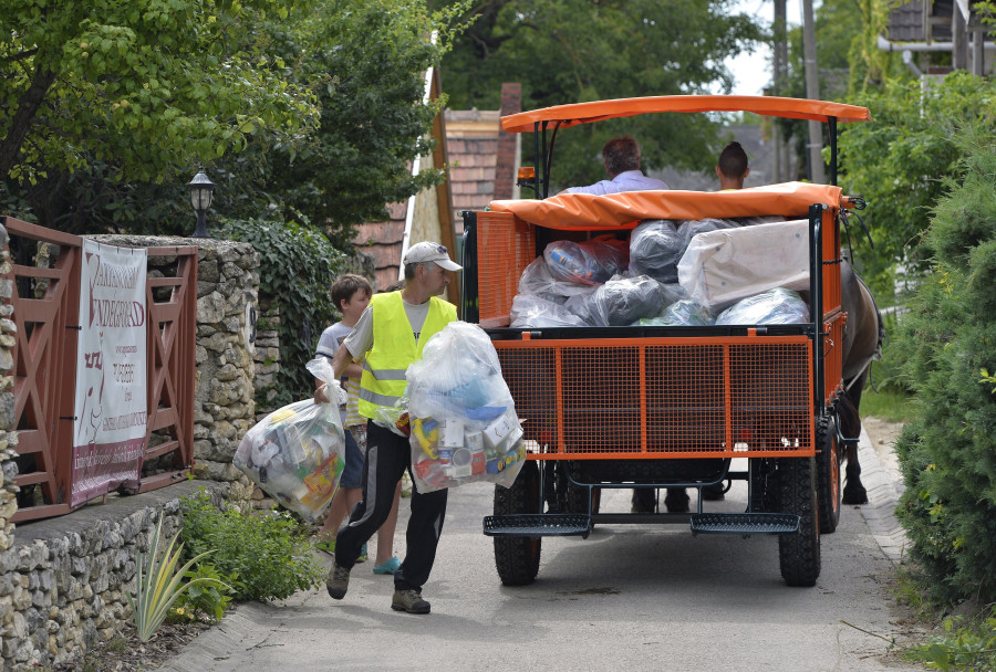 Nagyvázsony, 2016. június 30. Lovas kocsival gyűjtik a szelektív hulladékot Nagyvázsonyban 2016. június 30-án. A Veszprém megyei községben a lovas kocsis begyűjtés folyamatának modellezése zajlik egy hulladékgazdálkodási egyensúlyjavító projektjavaslat keretében. MTI Fotó: Máthé Zoltán