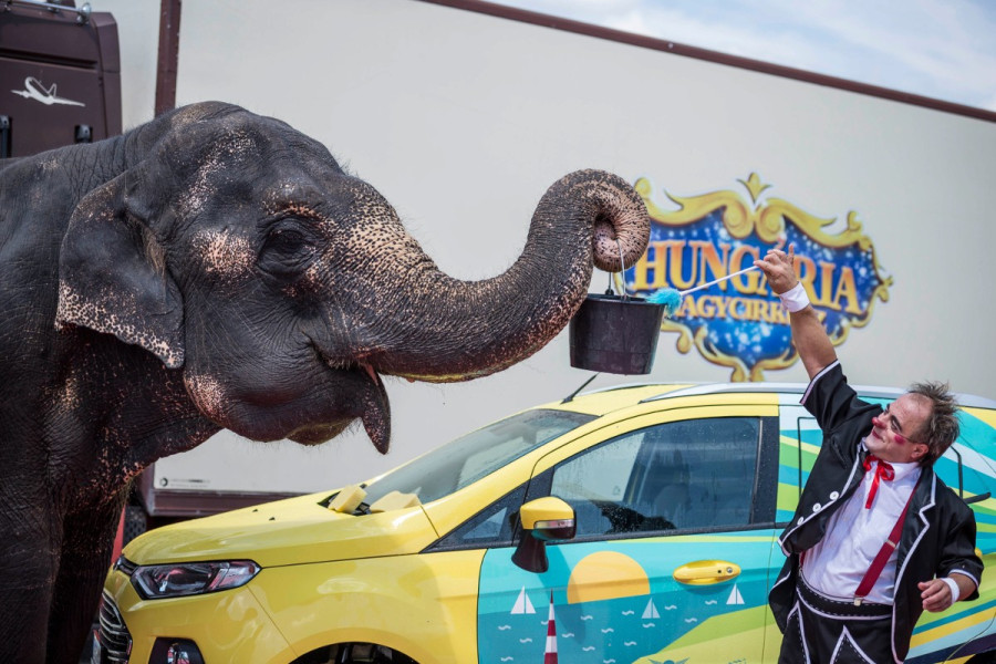 Nme mindennapi látvány fogadta az arra járókat Balatonalmádiban pénteken: elefánt mosott egy autót. Az akcióval arra akarták felhívni a figyelmet, hogy egy autómosás áráért színház-, múzeum- vagy cirkuszjegyet vásárolhatnának az emberek. Az MTI fotóit Bodnár Boglárka készítette.