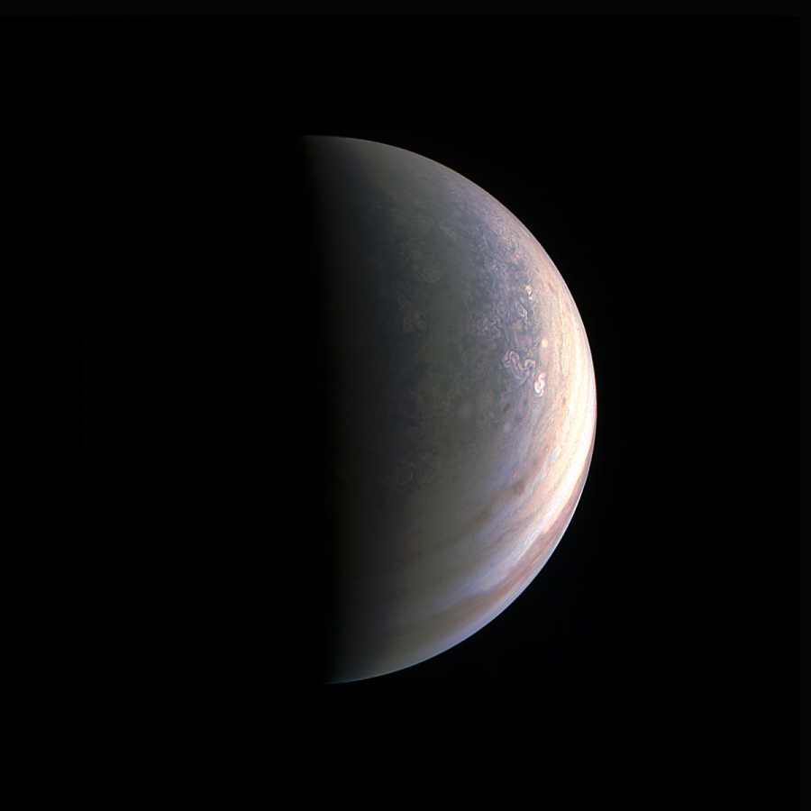 A Juno vasárnap közelítette meg először a bolygót, ekkor mindössze 4200 kilométerrel a felső felhőréteg fölött haladt el, és hat órájába telt az északi sarktól a déli sark fölé repülni. A visszakapott hat megabájtnyi adatot elemezve Scott Bolton, a Southwest Research Institute vezető megfigyelője elmagyarázta, hogy mit érdemes figyelni a képeken: a sarkvidék a Jupiteren kékesebb színű, mint a bolygó többi régiója. Időjárás szempontjából feltűnhet, hogy hiányoznak a bolygót jellemző, a forgási irány mentén sávosan elhelyezkedő felhők. Ráadásul a sarkvidéki felhők árnyékot vetnek, ami arra utal, hogy magasabban helyezkednek el a környezetükben található felhőrétegeknél.