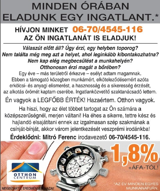 Az Otthon Centrum ingatlanközvetítő cég veszprémi irodája másfél éve áll a környékbeliek szolgálatában. A több mint tízéves múltra visszatekintő vállalkozás mára mintegy 150 irodával rendelkezik országszerte, ehhez a franchise vállalkozáshoz csatlakozott a Jutasi úti leányvállalat.