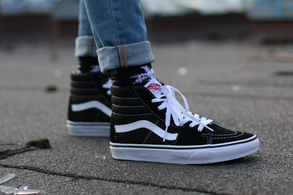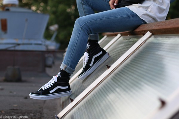 Vans Sk8-Hi blackwhite – feltűrt nadrággal és Vans vagy HUF zoknival. De mindenképp hosszú szárú legyen! :)