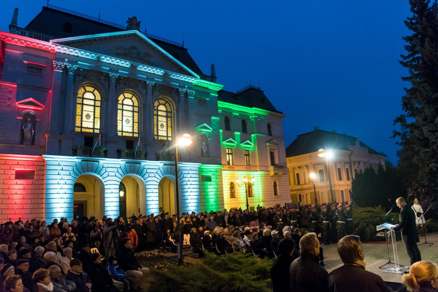 Az önkormányzat ünnepségén elsőként Takács Szabolcs kormánymegbízott tartotta meg beszédét. "Nehéz elhinni, hogy már hatvan éve annak az ősznek, amikor az egész világ Magyarországra figyelt" – kezdte a kormánymegbízott. "Egyre kevesebb ’56-os hős él már köztünk, de hálával és tisztelettel tartozunk irántuk, és kötelességünk emlékezetünkben őrizni őket."