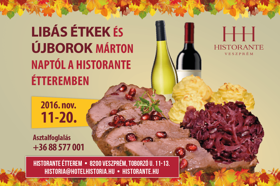Márton nap... Inkább népi hagyományként tekintünk rá, mint igazi ünnepként, pedig az egyre rövidülő, szürkülő késő őszi napokon mindenkinek jólesik egy kicsit ünneplőbe öltöztetni testét-lelkét. Látogasson el Historante éttermünkbe, ahol 10 napon át ízletes libafalatokkal és üde újborokkal segítünk fenséges ünneppé varázsolni a hagyományt!