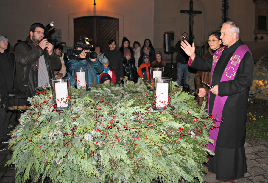 Nagy Károly, a Szent Mihály bazilika plébánosa a fogyasztói társadalmat kritizálta: ma nem várakozunk, mindent azonnal akarunk, sürgünk-forgunk, nincs semmire időnk, sokszor még élni sincs időnk. A sötétségben keressük a fényt, az első lángot az adventi koszorún, amibe „beletekintünk és felmelegedik a szívünk”.