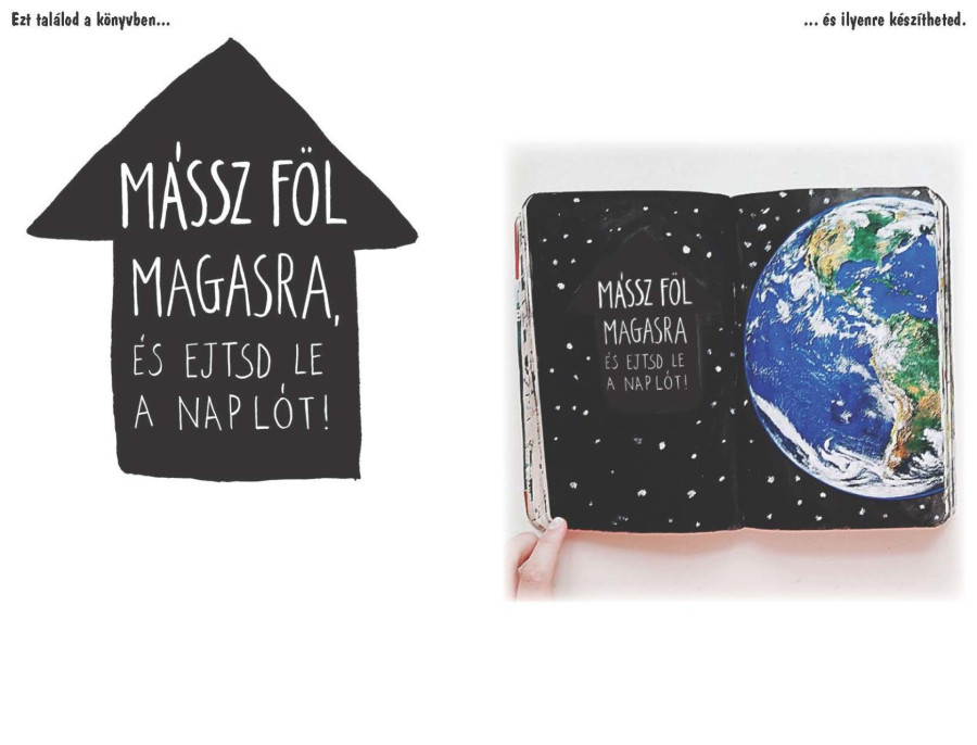 Miért? Mert a kreativitásom határainak feszegetésére, alkotásra, nyitottságra buzdít, arra, hogy nyugodtan legyek merész és felszabadult, a maximalizmusomat pedig vágjam sutba időnként. A könyvben ugyanis olyan, elsőre akár teljesen őrültnek tűnő feladatok szerepelnek, minthogy másszak fel magasra és ejtsem le a naplót, öntsem le, írjak rejtett üzenetet és dugjam el egy ismeretlen zsebébe, vagy akasszam ki valahova, hogy mások megrongálhassák.