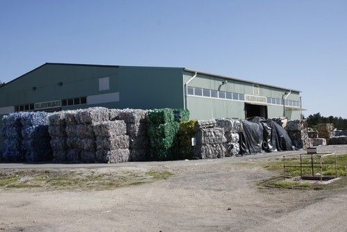 előtérben a tömörítésre váró műanyag palackok, hátrébb a bálázott papír