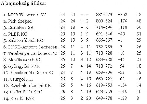 A vége 40:22 lett. A Mocsai-legénység már biztosan megnyerte az alapszakaszt. Ami veszprémi oldalon öröm, az a Győr férfi kézilabda csapatának komoly szomorúság. A többszörös magyar bajnokcsapat ugyanis egy ideig az utolsó meccsét játszotta a legmagasabb osztályban. A zöld-fehérek utoljára 1964-ben búcsúztak az élvonaltól. A győri kézilabda műhely válogatott játékosok sorát adta a férfi szakágnak. Elég csak az MKB jelenlegi gárdájából Liszkai Szilvesztert, illetve az Iváncsik-fivérek nevétt említeni.
