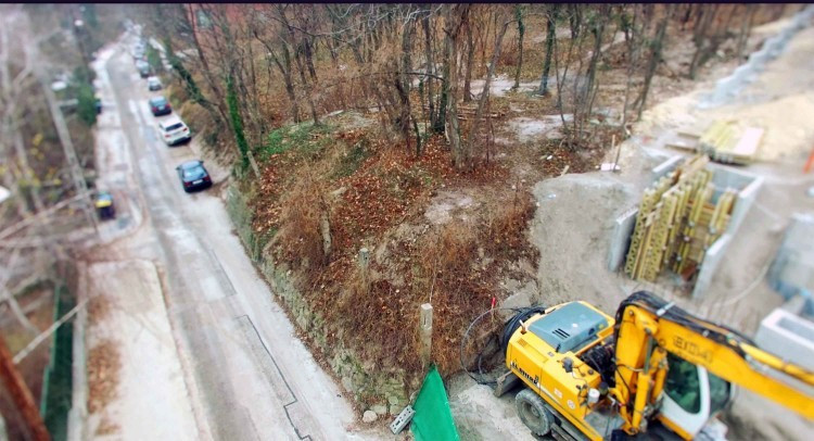 Voltak fák, amiket a telek felső szélén megpróbáltak megmenteni, ezeket körül is kalodázták, ám a gyökérzónájuk jelentős része elveszett, így a tavaly év végi szélvihar kidöntötte őket. „Ahogy az a földmunkánál is látszott, az elbontott rész jelentős része szikla volt, ennek a rétegnek a tetején viszont csak 50-60 centiméteres humusz van, így az itteni fák nem rendelkeznek mély gyökérzettel, ehelyett szétterülő gyökereik vannak.”