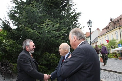 A vendéget Debreczenyi János polgármester, illetve Czaun János és Porga Gyula alpolgármesterek köszöntötték az épület előtt.