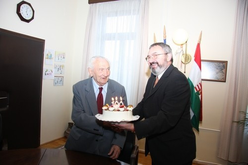 A ma is jó egészségnek örvendő szabómester (saját bevallása szerint egyetlen fillért sem költ gyógyszerre szerény nyugdíjából!) a hivatal kocsiján érkezett a városházára, ahol a százas számmal díszített torta fogadta a polgármester dolgozószobájában.