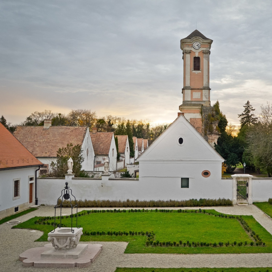 Az épülethármas elemeként magasodott a templom. Az idő vasfoga ezt is megbontotta, ma már csak a harangtornya áll, az építészeknek köszönhetően viszont pazar kilátás nyílik innen a környező településekre. Grátiszként a toronyóra muzsikája igazi barokk hangulatot idéz.