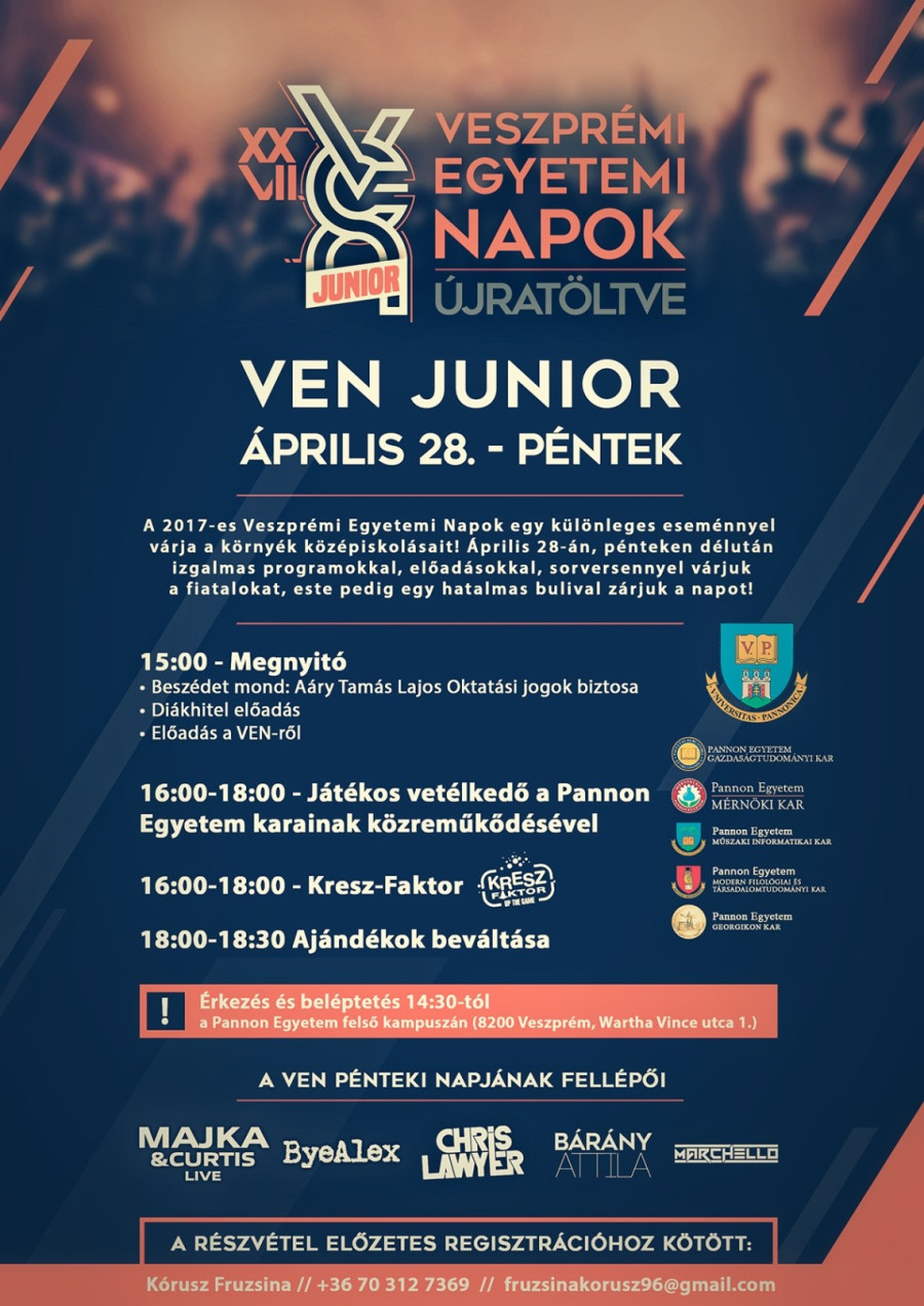 Az egyetemisták mellett a középiskolásokra is gondoltak az idei VEN szervezői. Árpilis 28-án Junior programmal várják őket, aminek keretében betekinthetnek a Pannon Egyetem életébe.
