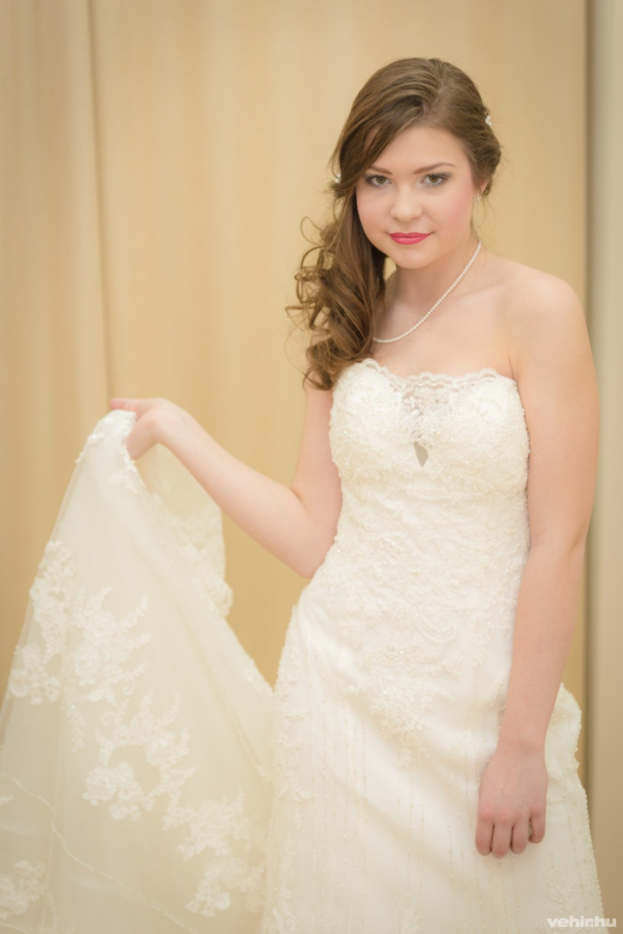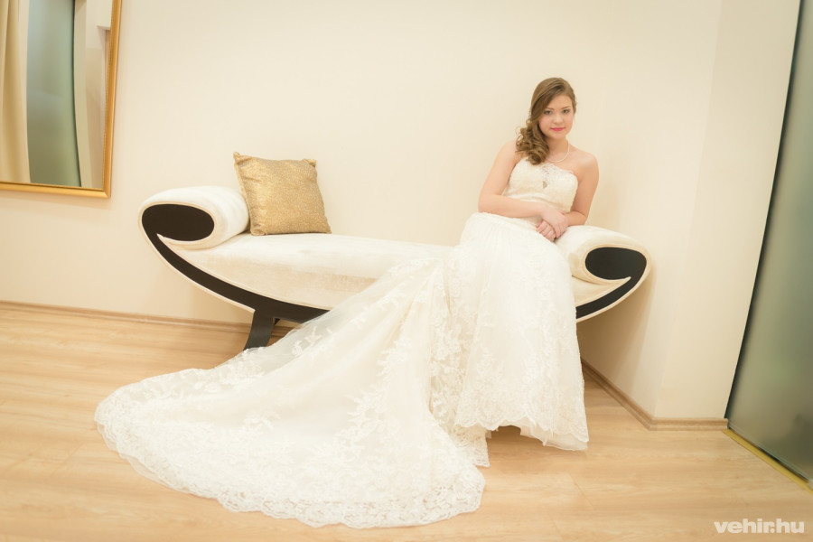 A pántnélküli, félsellő fazonú ruhát hatalmas uszállyal álmodták meg a tervezők, amelyet az elejétől a végéig finom francia csipkével borítottak. A szoknya aljára varrt csipke applikációktól kiterítve az uszály még nagyszerűbben mutat, amit mindenki megcsodálhat, miközben a menyasszony az oltár felé lépdel. Kétségtelenül nagy élményt fog nyújtani viselőjének és a boldog párnak örvendő násznépnek is.