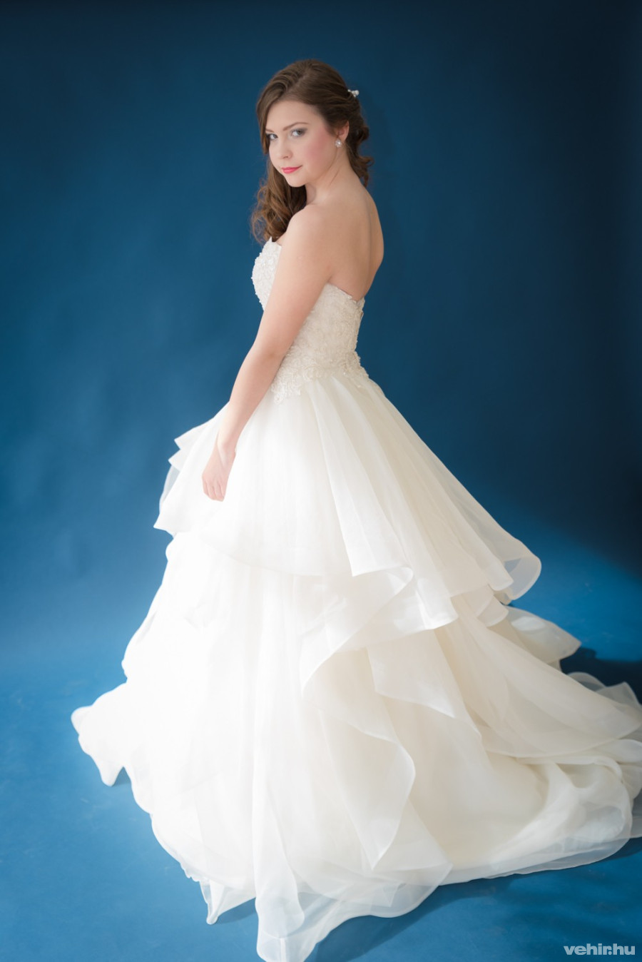 A különleges, negédes, szív alakú dekoltázzsal ellátott gyöngyös csipke felsőrész fantasztikus eleganciát kölcsönöz a ruhának, hullámos szoknyarésze pedig még különlegesebb hangulatot varázsol neki. A szoknyára szabálytalanul rávarrt fodrok, az uszály, az egyes rétegek eltérő hossza játékossá, és a többi nagyszoknyás menyasszonyi ruhához képest kivételessé teszik a márka darabját. Találóbb fantázianevet nem is kaphatott volna: az organza és a csipke házasítása, az anyag minősége, fajtája, a ruha kialakítása igazán csábítóvá teszik az összképet. Nem csoda, ha egyre több cég törekszik hasonló megoldásokra.