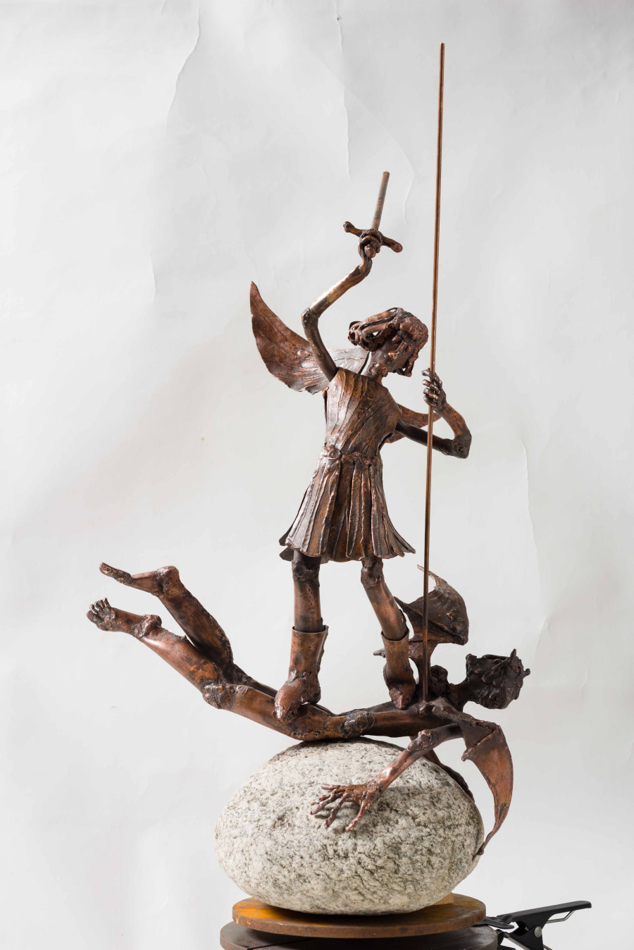 A Szent Mihály-szobor magalkotására Madarassy István szobrászművészt kérték fel. Szent Mihály az érsekségnek, a Veszprémi Bazilikának, a történelmi városmagnak, Veszprémnek is védőszentje. Egyike a hét arkangyalnak, Ő a mennyei hadak vezére és győztes harcosa. A művész a Szent Mihály-ikonográfiának azt az ismert, gyakran ábrázolt pillanatát ragadta meg, amelyben az arkangyal az Isten ellen fellázadt gonoszt legyőzte, majd letaszította a Földre.