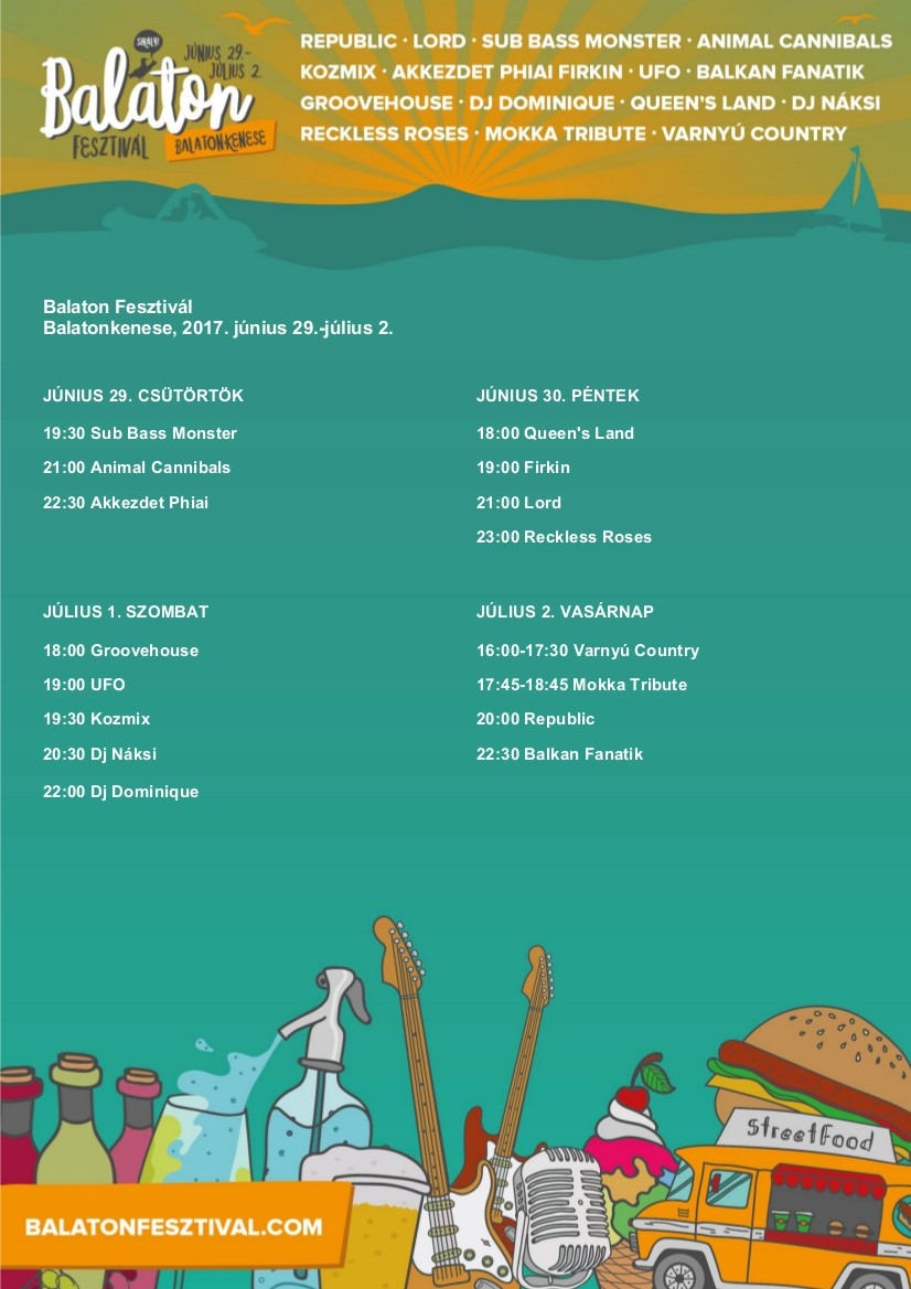 A fesztivál zenei kínálata változatos. A nyitónapon a hazai legismertebb rapcsapatoké lesz a főszerep. A közelből érkezik a Sub Bass Monster, de fellép az Animal Cannibals és a Akkezdet Phiai formáció is. Pénteken zúzós rock programmal készülnek a szervezők. Az Élő Zene Fesztivál régiós nyertese, a veszprémi Queen’s Land nyitja az estét, majd az ír rockot játszó Firkin csap a húrok közé, a rock nagyjai közül a Lord érkezik, és a sort a Magyarország legautentikusabb Guns 'N' Roses tribute zenekara: a Reckless Roses zárja. Szombaton hamisítatlan retró bulival várják az érdeklődőket, a Groovehouse, az UFO, a Kozmix és két népszerű DJ, Náksi és Dominique hozza el a nyarat Balatonkenesére.