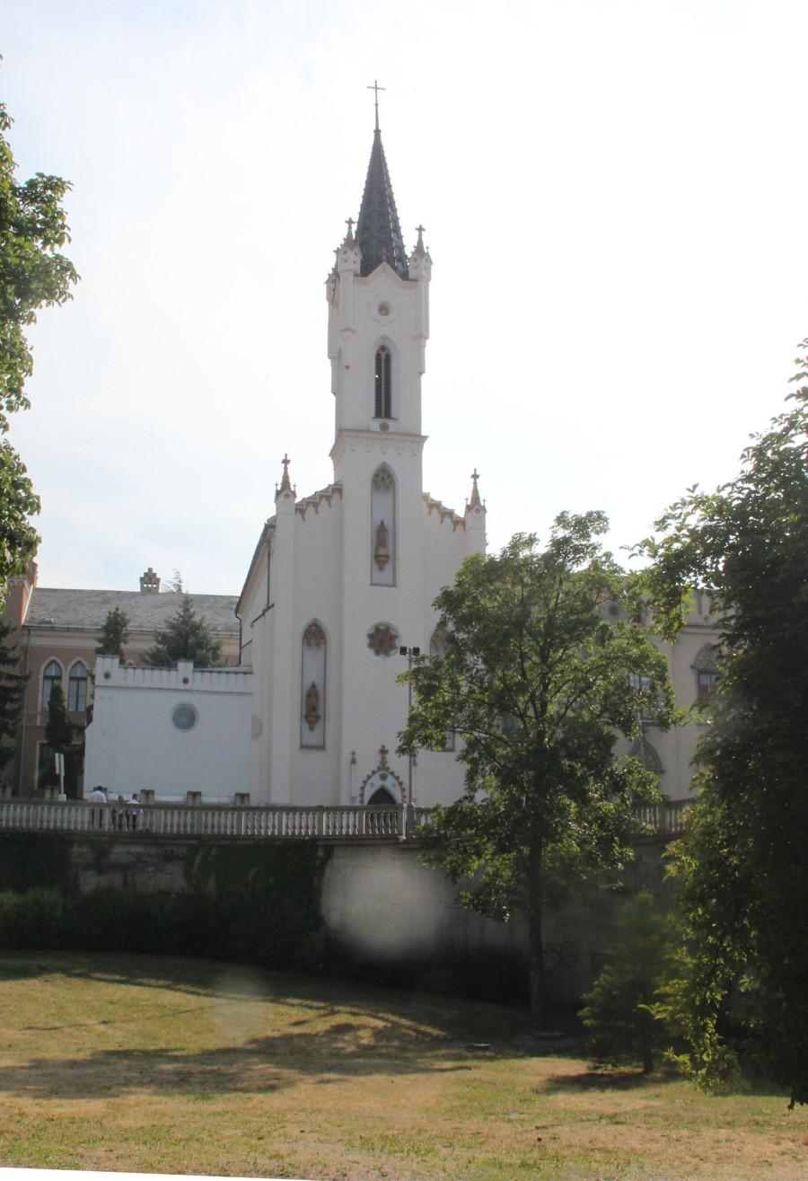 A háttérben látható Regina Mundi (Világ Királynője) templom 1860-ban épült Ranolder János megyés püspök kezdeményezésére, 1860. szeptember 16-án pedig maga a püspök szentelte fel a neogót stílusú építményt. A templom lábazata homokkőből épült, a bejárat keretét és lépcsőjét pedig almádi vörös kőből faragták. Kerámiából készült az ajtó fölötti ornamentika, a szobrok, és a szoborfülkék keretezése, a rózsaablakok, a lépcsőzetes attika alatti díszítés, a torony ablakkeretei és rozettái, valamint a fiatornyok süvege. A bejárat fölötti aranyozott díszek, valamint a szobortartó konzolok terrakottából (égetett agyagból) készültek. A homlokzati részen a szoborfülkékben Szűz Mária, Szent István és Szent Imre szobra került elhelyezésre. A torony harmadik emeletén csúcsíves záródású harangnyílásokat alakítottak ki. A torony négy sarkán fiatornyok ülnek. A nyolcszögű, karcsú, fémlemezes fedésű toronysisak élein kúszólevelek futnak a csúcson elhelyezett keresztvirágig, amely fölött egyszerű kovácsoltvas kereszt áll.