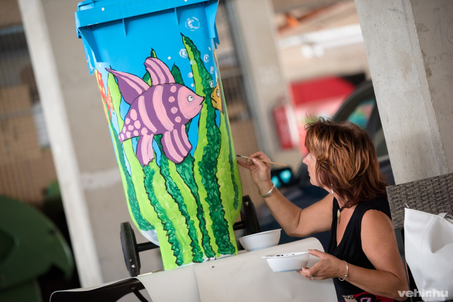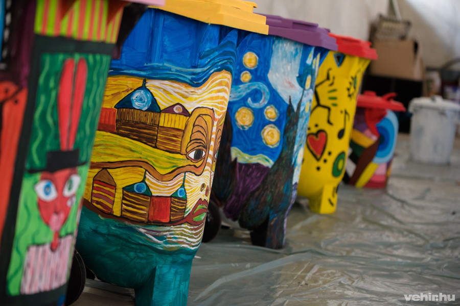 B. Hegedűs Piros, a diákok munkáját irányító pedagógus kérdésünkre elárulta, nem idegen tőlük, hogy szabadtéri felületeket vagy tárgyakat dekorálnak ki: 17 éve hagyományosan minden esztendőben megtartják az Art Actiont a Gizella Napokon, a Tűztorony lábánál, de festettek már Zircen is többször köztéri alkotásokat. A VKSZ Zrt. Színezzük ki Veszprémet! pályázatára végül utólag jelentkeztek, de a felhívás – különösen a kukánként kapott 2 napos Strand Fesztivál belépő fejében – különösen népszerű volt a diákok körében, így végül már csak a tervek legjavát kellett kiválogatnia a tanárnőnek.