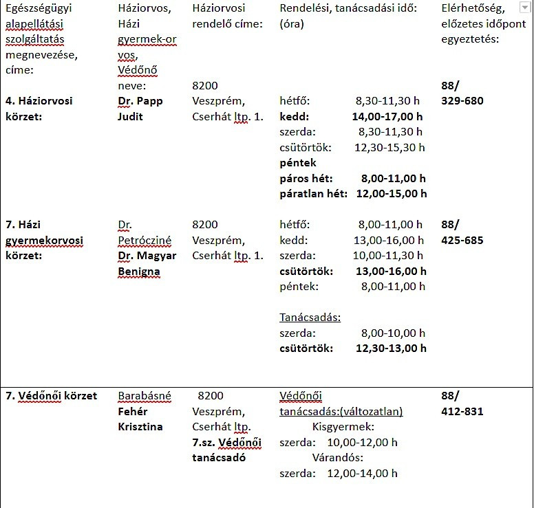 Értesítjük a fenti változással érintett lakosságot, hogy Dr. Papp Judit háziorvos és Dr. Petrócziné Dr. Magyar Benigna házi gyermekorvosok - a Kádárta városrészen élők részére is - a Veszprém, Cserhát ltp. 1. szám alatti rendelőikben (az autóbusz pályaudvarhoz közeli épületben) biztosítják 2017. augusztus 1-től a háziorvosi és a házi gyermekorvosi rendelést, valamint a csecsemő-kisgyermek tanácsadást.