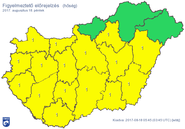 Az Országos Meteorológiai Szolgálat MTI-hez eljuttatott veszélyjelzése szerint Budapesten és Pest, Baranya, Bács-Kiskun, Békés, Csongrád, Fejér, Győr-Moson-Sopron, Hajdú-Bihar, Heves, Jász-Nagykun-Szolnok, Komárom-Esztergom, Somogy, Tolna, Vas, Veszprém, Zala megyében van érvényben elsőfokú figyelmeztetés. Azt írták: a napi középhőmérséklet az ország nagyobb részén eléri a 25 Celsius-fokot. A nappali maximumok várhatóan 30-35 fok között alakulnak (a déli, délnyugati tájakon lehet a melegebb). Késő este 20-26 fokig csökkenhet a hőmérséklet.