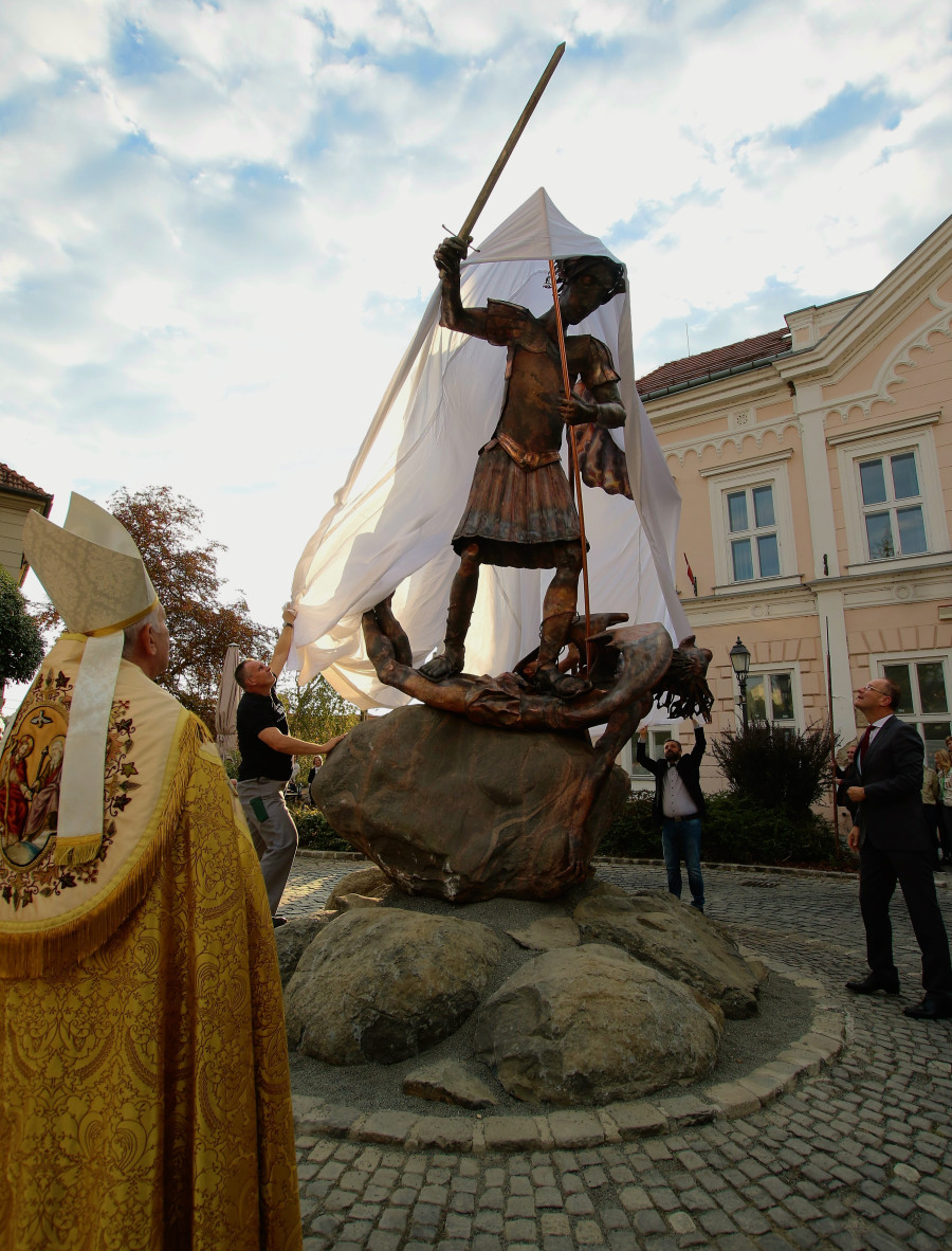 Szent Mihály a védelmezőnk, és ahogyan a bizalom a hidaknál Nepomuki Szent János szobránál megjelenik, a gyónási titok mártírjában, az egykor volt várhíd kezdeténél, úgy itt, a piactér, a polgárváros közepén Szent Mihály szobra áll, ami azt mutatja, hogy nem csupán a Szent Mihály-székesegyház, hanem a város polgársága is fontosnak tartja, hogy legyen egy olyan pont itt a városban mindig, a legforgalmasabb helyen, a transzcendencia és az evilágiság határán, ahol barátokat üdvözlünk, ügyeket intézünk. Fontos, hogy egy pillanatra a szoborra tekintve eszünkbe jusson az is, hogy most jól élünk, biztonságban, de ez a biztonság és jólét nem garantált, nem teljes egészében rajtunk múlik. Ha egy közösség erős, akkor sok veszélyt elháríthatunk, de az ember gyarló, nem tudunk minden veszélyt elhárítani, sőt a legtöbb esetben a saját gyarlóságunkból adódó veszélyt nem tudjuk elhárítani. Szent Mihály erre is emlékeztethet minket…"- mondta.