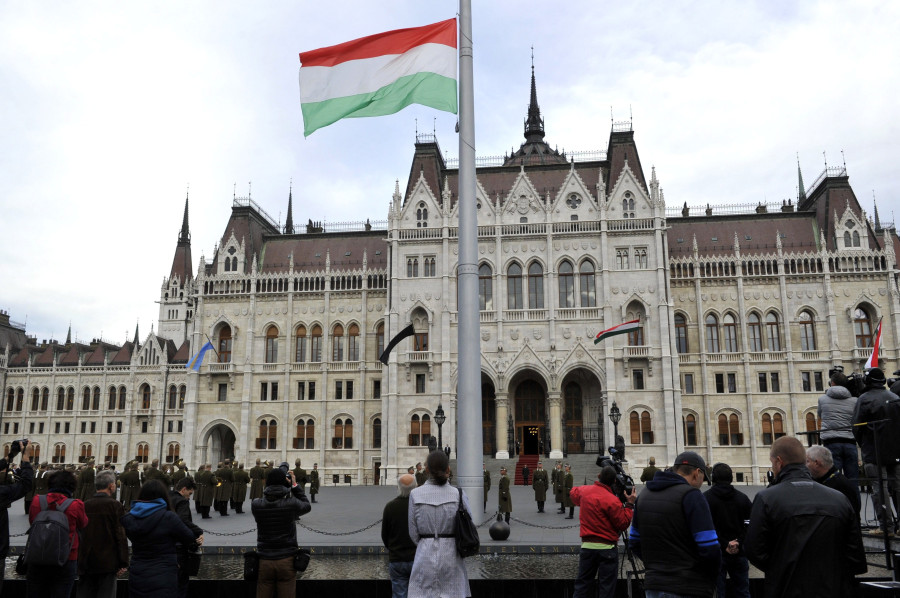 Áder János köztársasági elnök jelenlétében katonai tiszteletadással felvonják, majd félárbócra eresztik Magyarország lobogóját az aradi vértanúk emléknapján, 2017. október 6-án, a nemzeti gyásznapon.