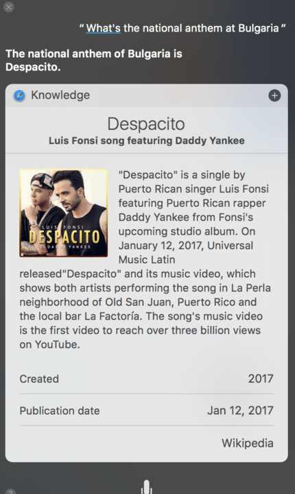 Mint ahogy már korábban írtunk róla a maga közel 5 milliárdos lejátszásával a Despacito lett a világ legtöbbet streamelt száma. A Mashable szerint Luis Fonsiék remeke nem csak minket, hanem az Apple beépített asszisztensét, a Sirit is összezavarta, ugyanis arra a kérdésre, hogy mi Bulgária himnusza, az alábbi választ adta: