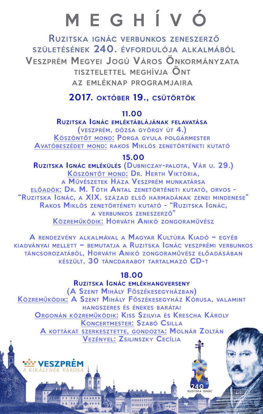 Ruzitska Ignác verbukos zeneszerző születésének 240. évfordulója alkalmából 2017. október 19-én.