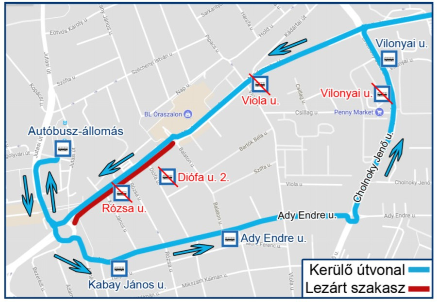 Az ÉNYKK tájékoztatása szerint a lezárás miatt a regionális és országos autóbuszjáratok az alábbi kerülő útvonalon közlekednek: Autóbusz-állomás – Jutasi út – körforgalom - Ady Endre u. – Cholnoky Jenő u. – Budapest út. A kerülő 500 méter plusz teljesítménnyel jár. A járatok nem érintik Veszprém, Viola u. elnevezésű megállóhelyet, helyette a Cholnoky u. – Vilonyai u.